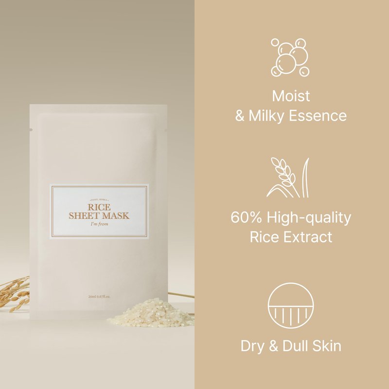 - BOOST UP GLOWING EFFECT WITH OTHER RICE LINE: Elevate your skincare routine by pairing our Rice Sheet Mask with other I'm From Rice essentials like Rice Toner, Rice Serum, and Rice Cream. Experience a synergistic hydration boost and achieve radiant, glowing skin with the complete Rice line.