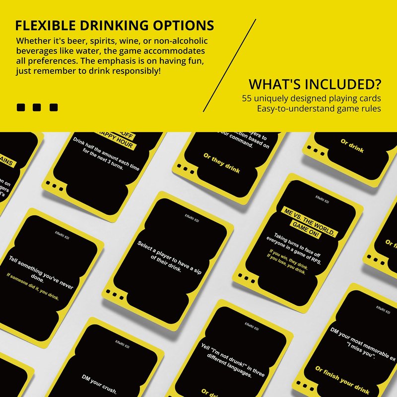 - FLEXIBLE DRINKING OPTIONS: Whether it's beer, spirits, wine, or non-alcoholic beverages like water, the game accommodates all preferences. The emphasis is on having fun—just remember to drink responsibly!