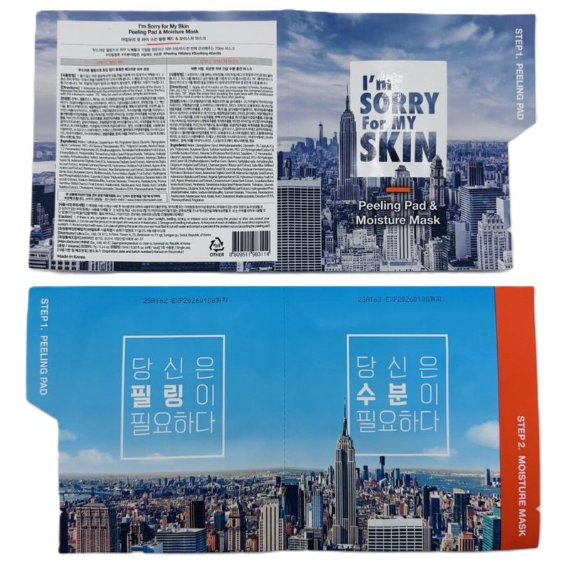 Discover the ultimate Korean skincare experience with the I'M SORRY FOR MY SKIN Peeling Pad & Moisture Mask. This 2-step skin care travel essentials kit includes: 1. Exfoliating face pads: gently slough off dead skin cells and impurities, revealing a brighter, smoother complexion. 2. Hydrating moisture mask pads: packed with nourishing botanicals to drench your skin in soothing moisture, leaving your skin plump and glowing. This Korean beauty set is the ultimate self-care indulgence for girls and women alike. Designed to give you glass skin wherever you go. Perfect for all skin types, this kit combines effective exfoliation with deep hydration to deliver a radiant, dewy glow skin. Compact and convenient, this kit is ideal for travel and vacation essentials. Achieve a flawless complexion with our premium skincare duo, perfect for both daily use and on-the-go skincare routines. Whether you're looking to cleanse and exfoliate or deeply moisturize, the I'M SORRY FOR MY SKIN Peeling Pad & Moisture Mask has you covered. Say goodbye to dull skin and hello to a radiant, refreshed look with this essential Korean skincare kit.