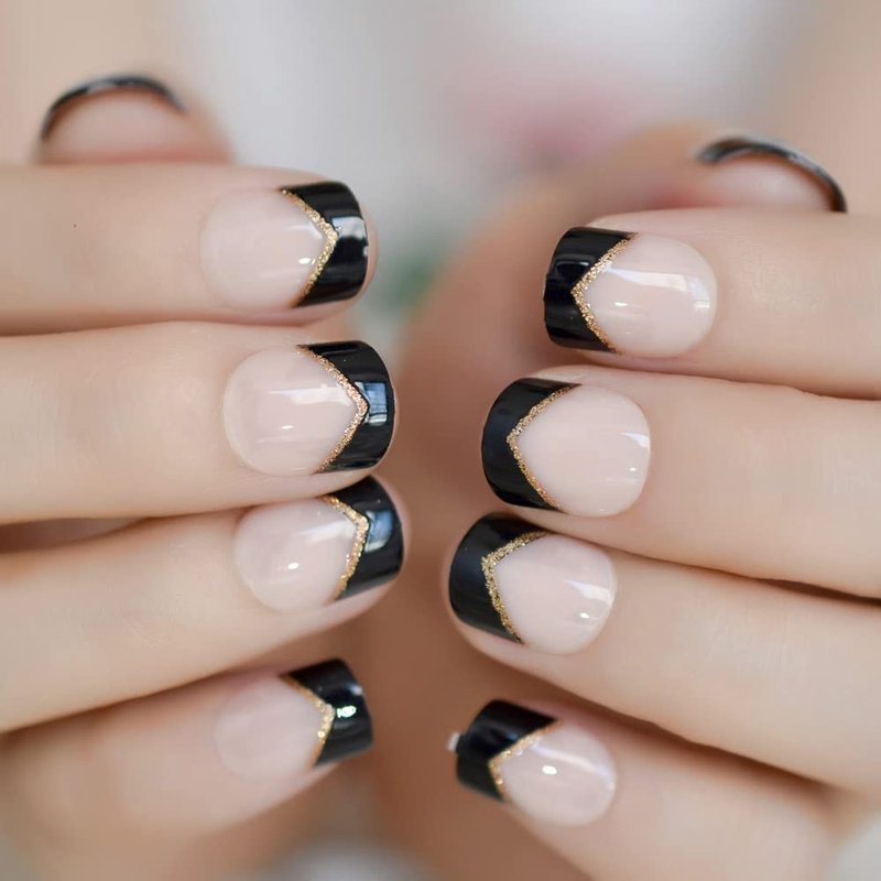 iMABC Press on Nails - Nude Black French Glitter Tips Fake Nail | Cute Short Glossy Shiny Solid False Nails | Glue Acrylic Decoration Manicure Gift for Girls Women 24Pcs