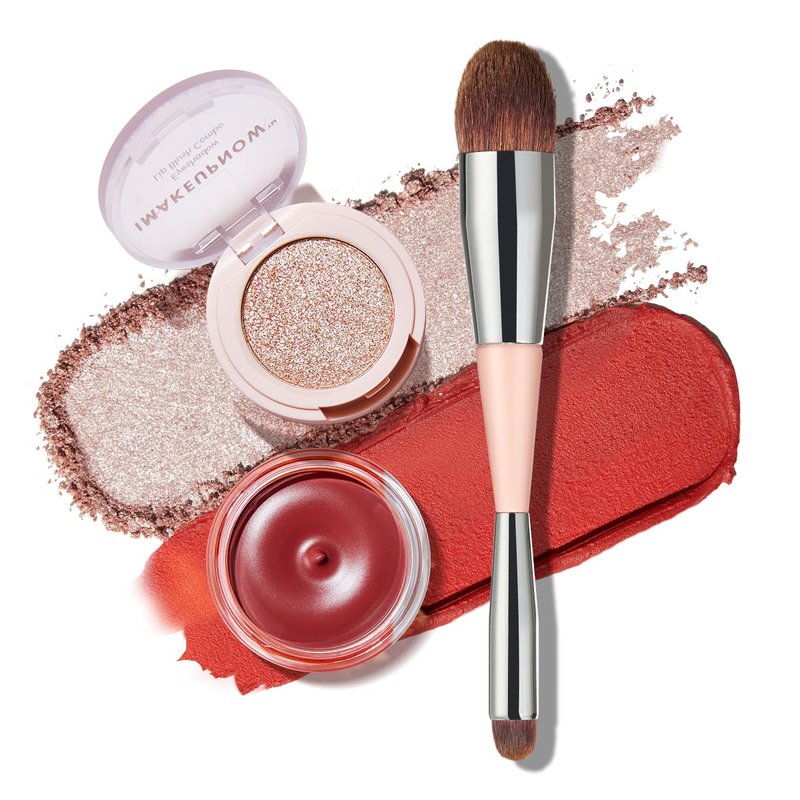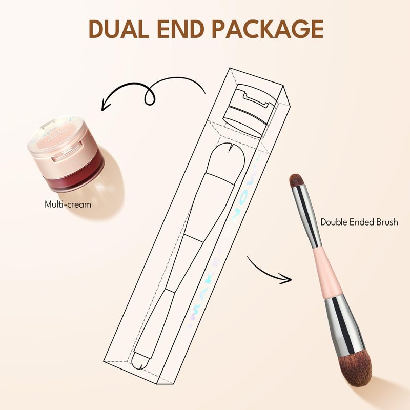 Blush cream set for cheeks, lips and eyes, which includes a multi-purpose cream and a dual-ended brush. The first layer of the lip and cheek cream is a light-colored shimmer, suitable for layering as eyeshadow or used as a highlighter; the second layer is a creamy, matte texture that is smooth and lightweight, ideal for use as blush, eyeshadow, or lipstick. Paired with the dual-ended brush, it allows for quick makeup application without worrying about color matching, saving time. Its small size is convenient for carrying and touch-ups on the go.
