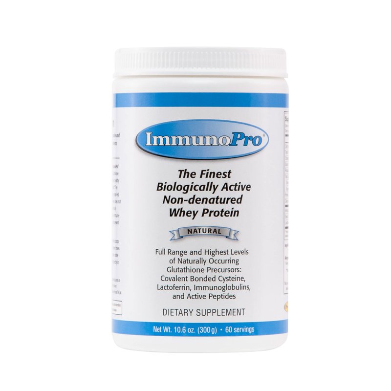 Made with Proserum: The Finest Whey Protein available. ImmunoPro is a proprietary, non-denatured, native whey that is minimally processed to maintain the full range of all the fragile immune-modulating and regenerative components naturally present in fresh raw milk. This means it naturally contains the highest possible levels of lactoferrin, immunoglobulins, serum albumin, active peptides, and growth factors. The milk for ImmunoPro is derived from cows that are grass-fed and graze year-round on natural pastures. It is Non-GMO, hormone-treatment-free, pesticide, and chemical-free and undergoes minimal processing. Its minimal processing produces a product that contains exceptional amounts of important protein components including the vital protein-bound fats not found in most whey protein isolates. Contains: Lactoferrin – 200 mg* per 5 grams. An iron-binding, iron-modulating protein that enhances iron absorption when needed. Immunoglobulins* – 500 mg* per 5 grams. Contains numerous immune system benefits. Bovine Serum Albumin* – 220 mg* per 5 grams. Along with Lactoferrin and Immunoglobulins, this type of protein contains cysteine and glutamine, precursors in glutathione (GSH) production. Active Peptides* (specialized paired amino acids) exhibit a beneficial information transfer factor effect on the immune system as well as intracellular glutathione. Growth Factors – (growth-promoting protein fractions) are contained within the protein-bound fats.