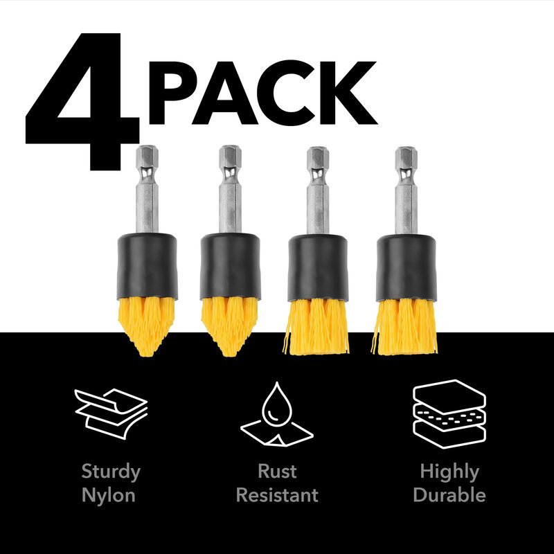 - Quick Change Shaft — This 2.5”L with ⅝”L bristles drill cleaning brush attachment set is designed with steel and nickel-plated quick change shafts. These drill brushes are compatible with cordless drills that accept 1/4" shaft accessories