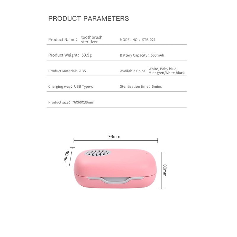 - CONVENIENT. Impressive Smile Rechargeable Mini UV Toothbrush Sterilizer Cover is very light, small in size and easy to carry. Weight is only 54.5g. Regardless where you are, you can always count on this Sanitizer to keep your toothbrush clean and safe to use. With 3 different color options, you can find one which is works for you the best.