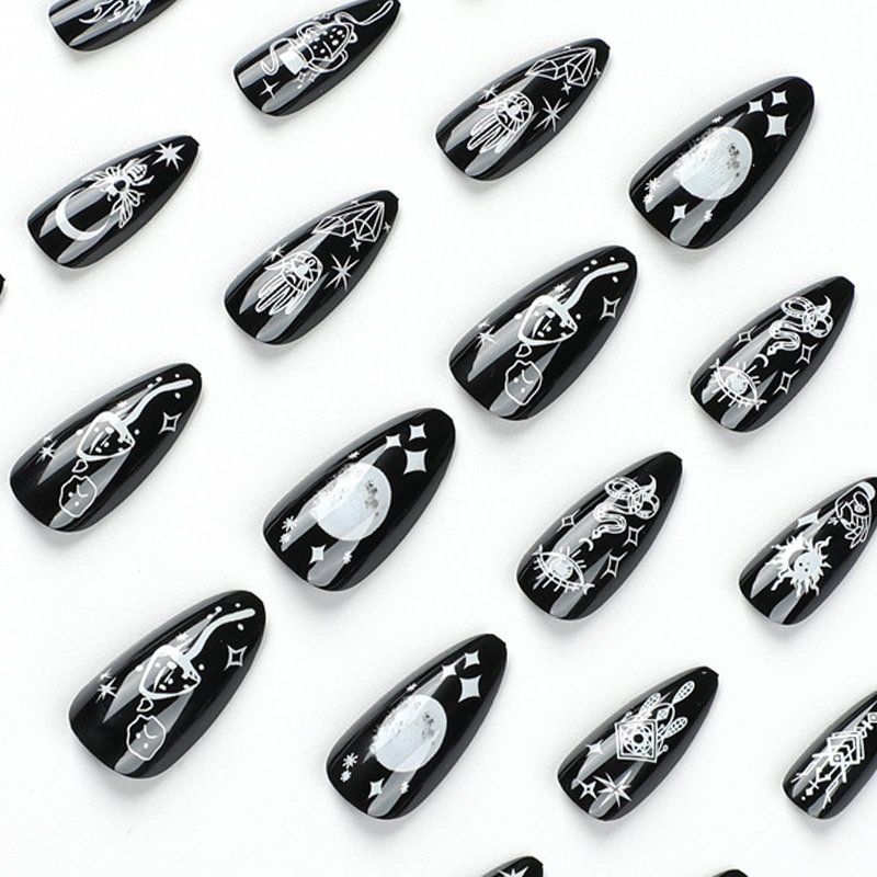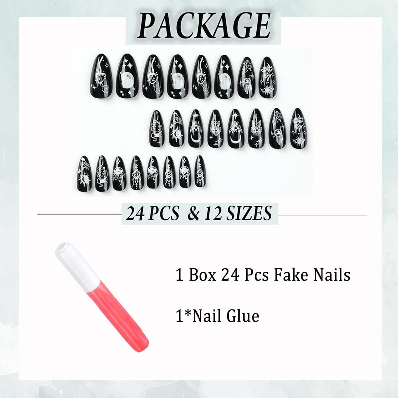 IMSOHOT Almond Press on Nails Medium Stiletto Black Fake Nails with Nail Glue Moon Star False Nails 24Pcs Full Cover Acrylic Nails
