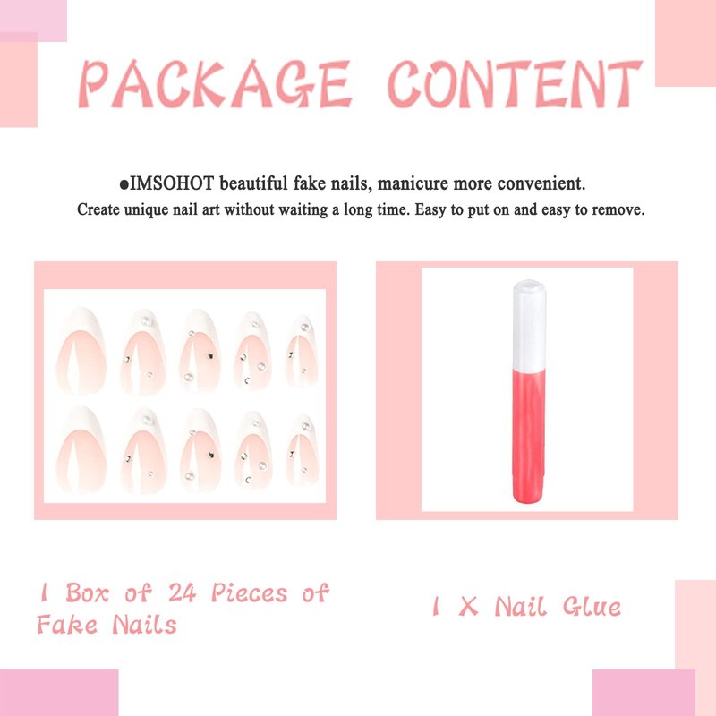 - [Package] - You will get 24 pieces of IMSOHOT medium press on nails, a small clear box with glue, and you can trim it to any length you want~