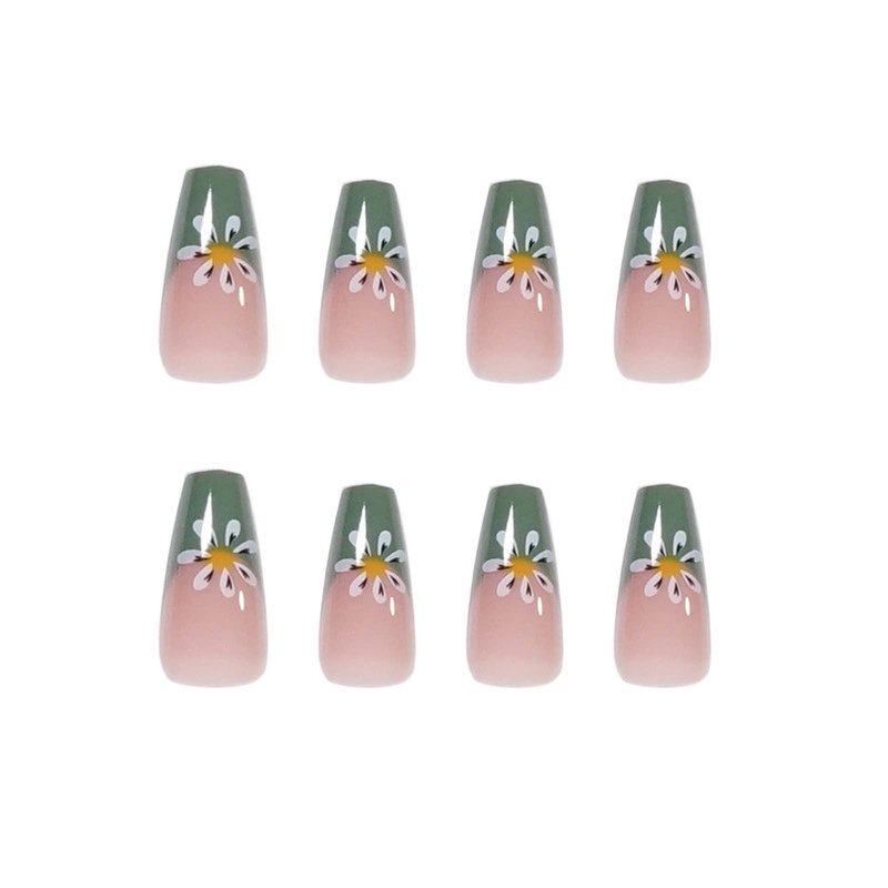 IMSOHOT Glossy Flower Press on Nails Medium Length Green Coffin Fake Nails French Cute False Nails Ballerina Glue on Nails for Women and Girls