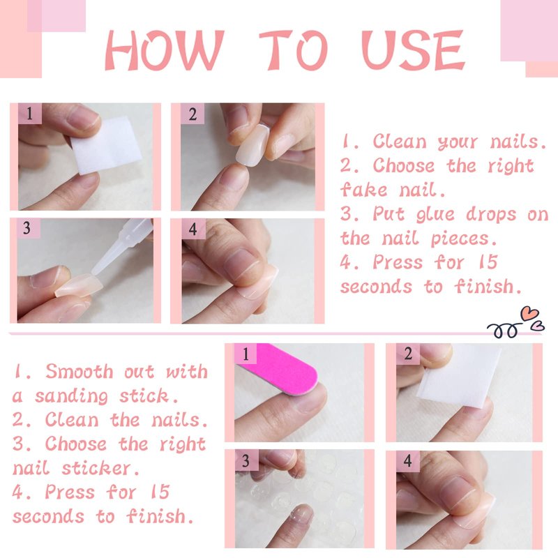 - [💕Easy to Use] - 1. Gently clean and sand the natural nails 2. Choose a nail piece of appropriate size,and then press it on the relative size of your fingernail. 3.Hold down the nail for 20 seconds.