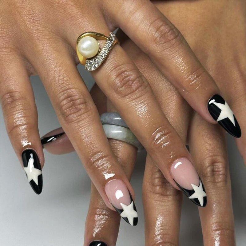 IMSOHOT Long Almond Press on Nails French Black Fake Nails Stiletto Star False Nails with Designs Y2K Glue on Nails Glossy Full Cover Acrylic Nails for Women 24PCS