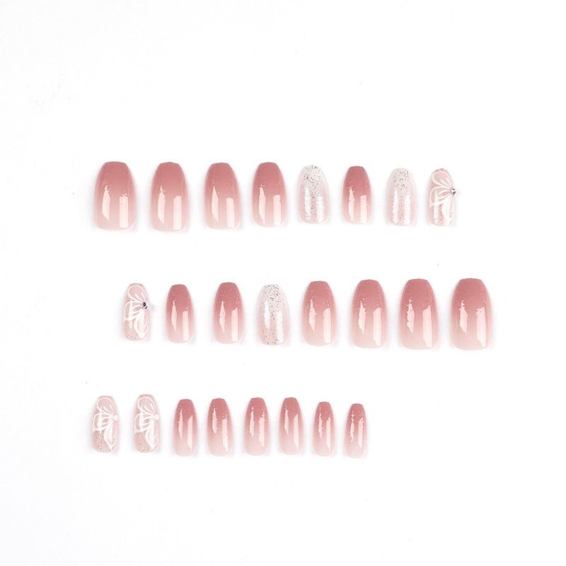 IMSOHOT Medium Press on Nails Coffin Pink Gradient Fake Nails Flash Flower Glossy Glue on Nails Ballerina Full Cover Acrylic False Nails for Women