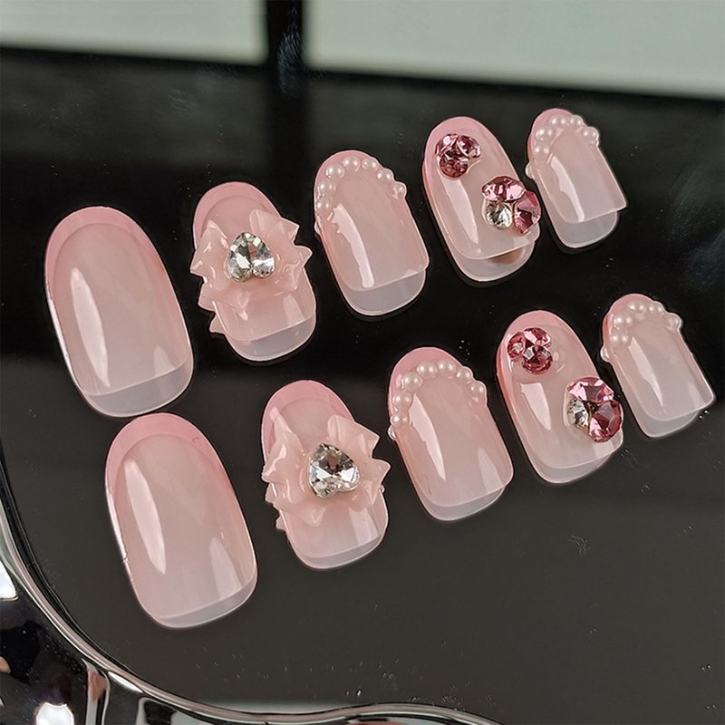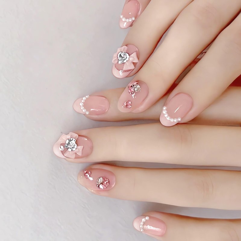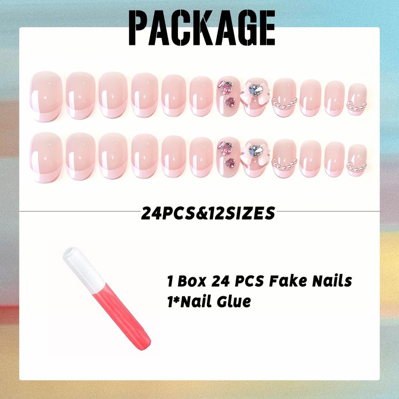 IMSOHOT Oval Press on Nails Pink Short Fake Nails French Tips Acrylic False Nails with Bow Tie Charms Designs Rhinestone Pearl Full Cover Glue on Nails Cute Glossy Nails for Women and Girls 24Pcs