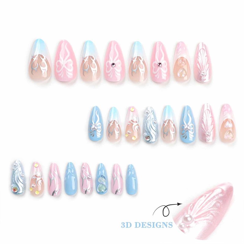 IMSOHOT Press on Nails Medium Almond Fake Nails Pink Blue Cute Glue on Nails with 3D Seashell Wave Texture Designs Full Cover Y2K Glossy Acrylic French False Nails Tips for Women and Girls 24Pcs