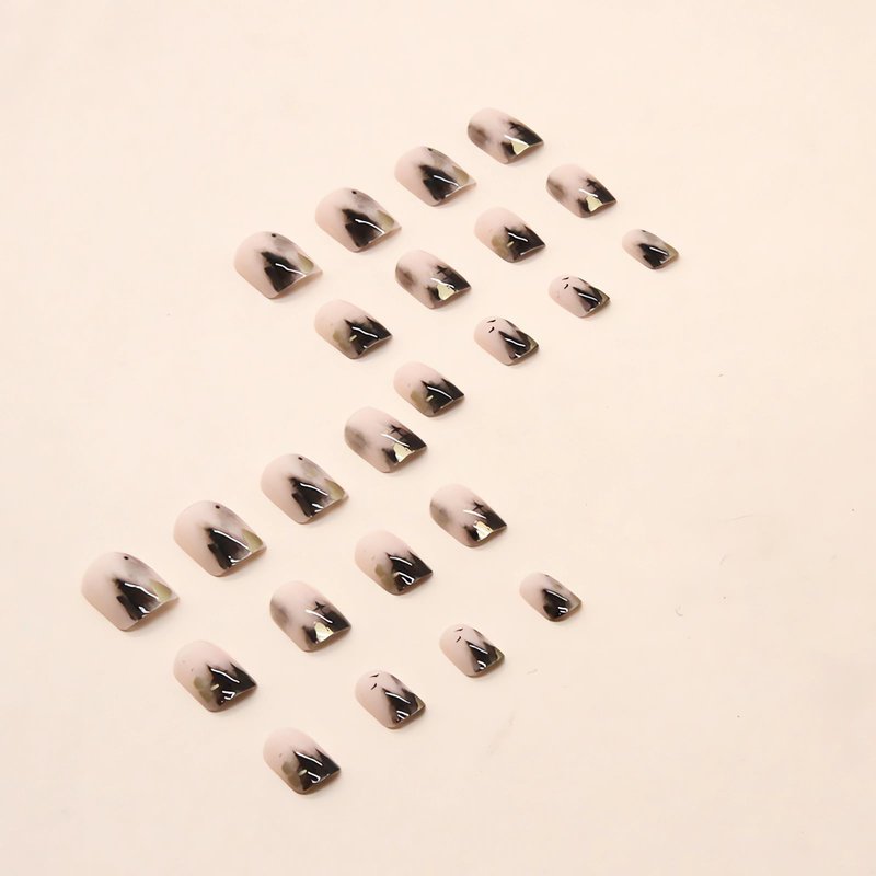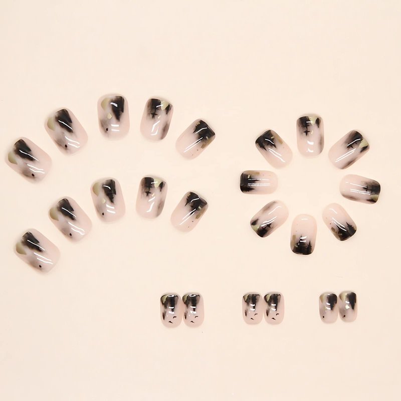 IMSOHOT Short Press on Nails Square Glossy Fake Nails Acrylic Squoval False Nails Glue on Nails Nude Nails with Ink Painting Designs 24PCS