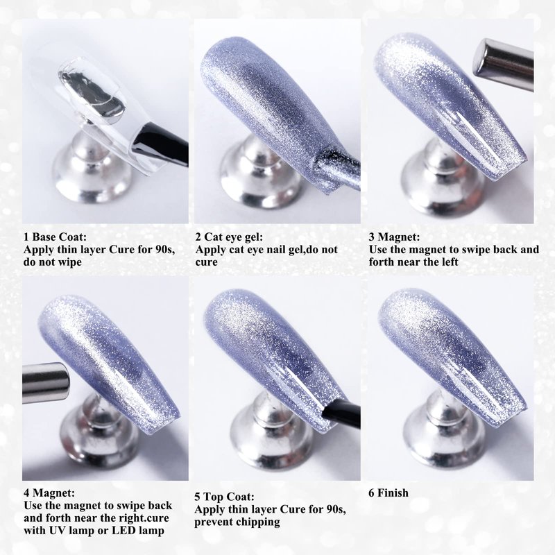 - 💎 Applying our Gel Nail Polish is a breeze, simply follow our step-by-step instructions for flawless results every time: Use the magnet to create desired pattern before curing. Apply gel top coat for gorgeous shimmery and sparkly finish. Heat up in winter to reduce thickness.
