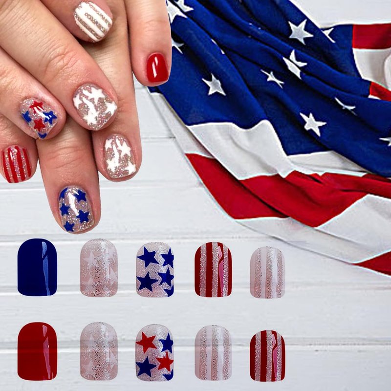 - Easy to Apply: Just choose the American flag nail piece that suits you, polish the nail bed, paste the jelly glue we provide, and press trendy nails for 30s to get the natural manicure that girls like. (Durability of jelly glue is not as good as liquid glue, but it makes fake nails REUSABLE. Please use suitable glue according to different scenes)