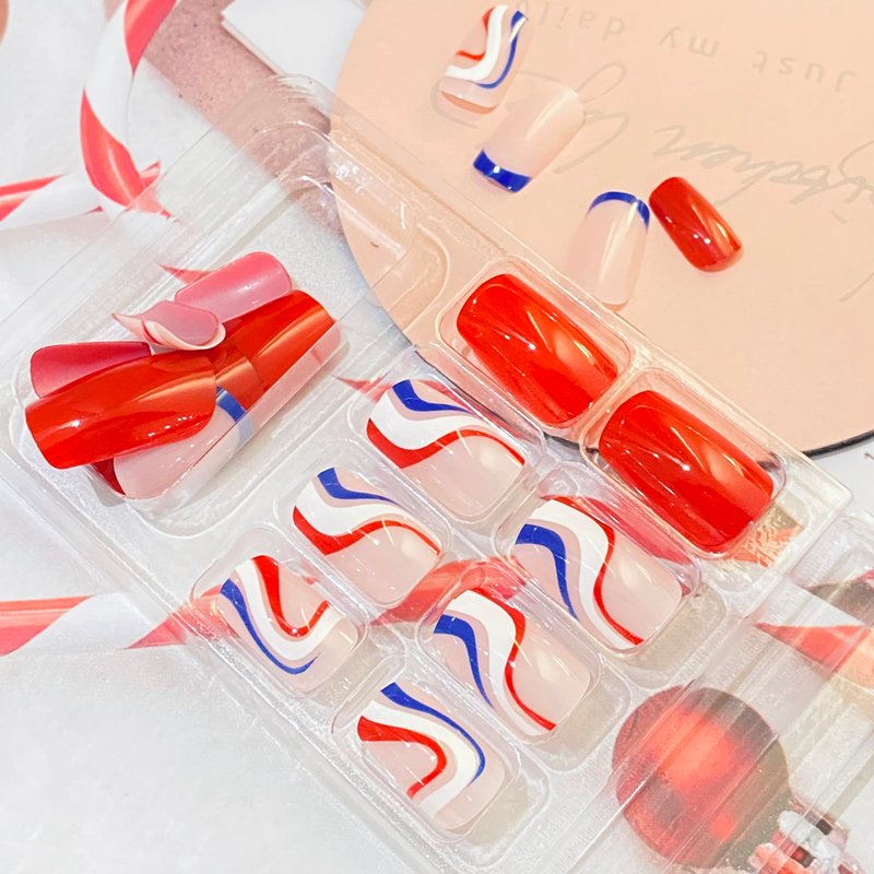 - 【Easy to Apply】Just choose the american flag nail piece that suits you, polish the nail bed, paste the jelly glue we provide, and press trendy nails for 30s to get the natural manicure that girls like. (Durability of jelly glue is not as good as liquid glue, but it makes fake nails REUSABLE. Please use suitable glue according to different scenes)