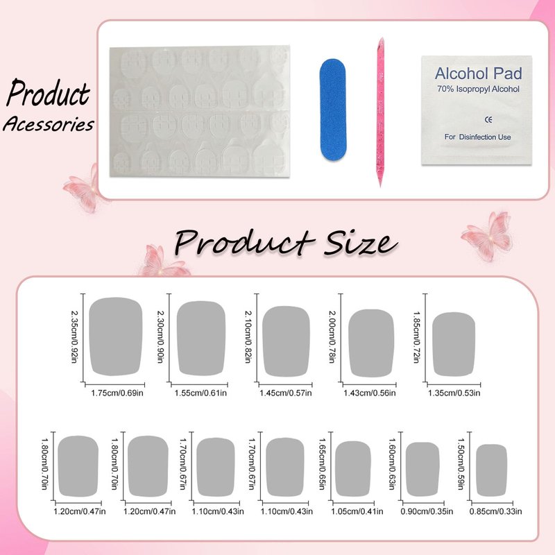 - 24 Pcs artificial independence stick on nails package with 1*Jelly Glue Stickers, 1*mini Nail File, 1*Wooden Stick, 1*cleaning pad. 12 sizes for different fingers, a finger size that is perfect for most people. You can choose the most suitable nail for yourself, it is easy to trim and file them to in any length and shape you like.