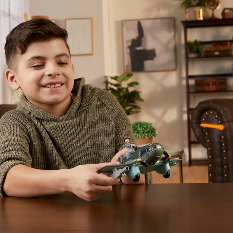 • DELUXE VEHICLE: This Indiana Jones plane toy features smooth rolling wheels, spinning propellers, an opening canopy, rotating turret, and tow hook