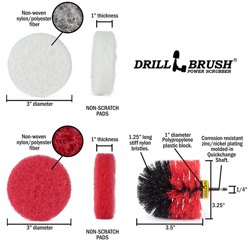 Our Drill Brush inspired scouring and scrubbing pads attach to a hook and loop backer, with a quarter inch quick change steel shaft that fits most all cordless drills and drivers. Utilize the power of your drill to save you from tedious hand scrubbing. Restore your bathroom surfaces and say goodbye to: Soap Scum, Hard Water Stains, Calcium, Mineral and Rust Deposits. These power driven scrub pads will shorten the time you used before to spend scrubbing by hand. The pads are reusable and will cut through mold, mildew, hard water stains, calcium, and rust. Our pads work well on tile and grout, sinks, bathtubs, showers, and baseboards. Drill NOT included.