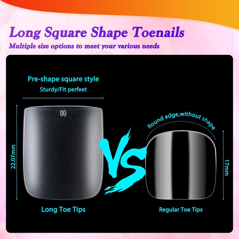 - MATTE TEXTURE: Our Square lONG toenail tips feature a matte frosted texture with stronger friction, allowing them to fit your natural nails more perfectly. Experience the convenience of our "pre-shaped file" design, which saves you time and effort. Say goodbye to worries about thinning and unsightly nails caused by polishing, as our tips provide better care for your nails