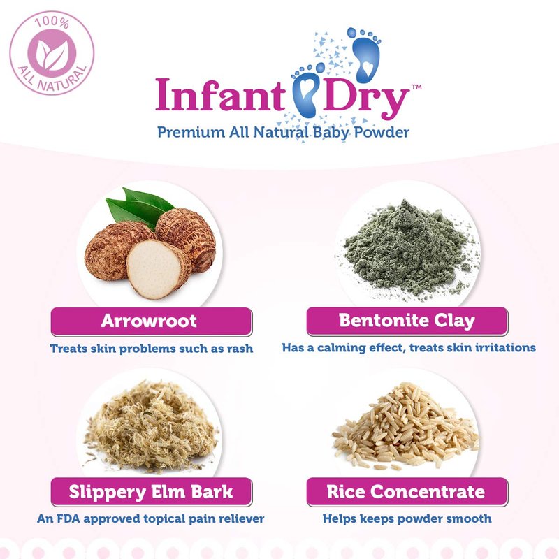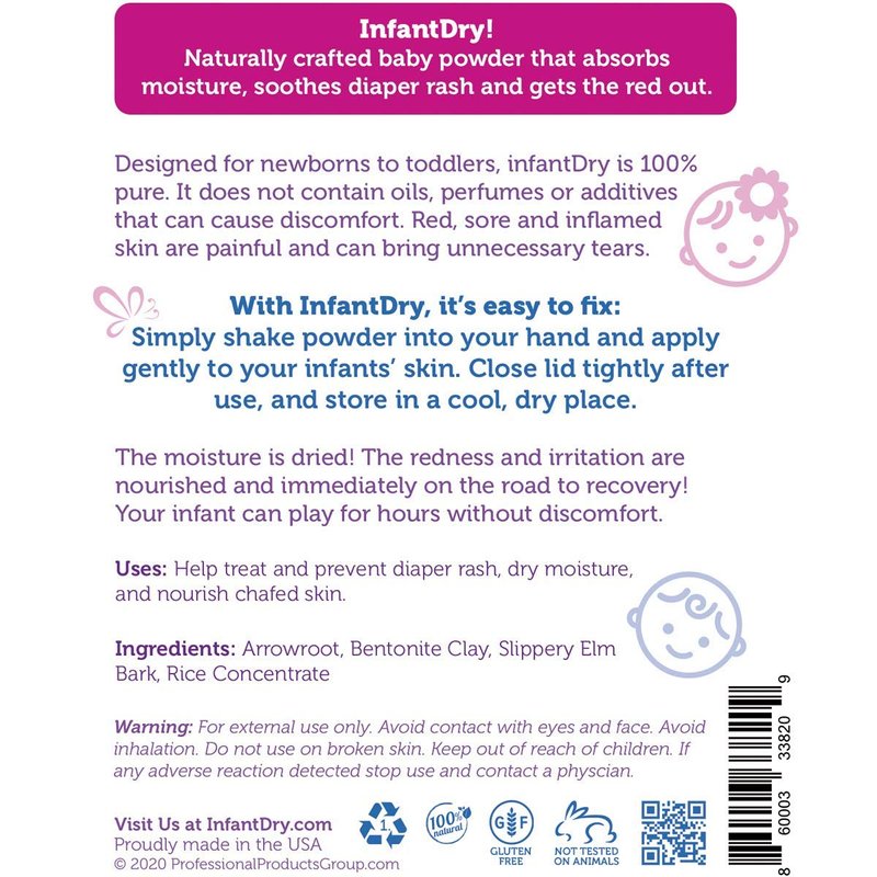 Infant Dry! Naturally crafted baby powder that absorbs moisture, soothes diaper rash and gets red out. Designed for newborns to toddlers, infant dry is 100% pure. It does not contain oils, perfumes or additives that can cause discomfort. Red, sore and inflamed skin are painful and can bring unnecessary tears. The moisture is dried! The redness and irritation are nourished and immediately on the road to recovery! Your infant can play for hours without discomfort. Uses: Help treat and prevent diaper rash, dry moisture, and nourish chafed skin. Ingredient: Arrowroot, Bentonite Clay, Slippery Elm Bark, Rice Concentrate Warning: For external use only. Avoid contact with eyes and face. Avoid inhalation. Do not use on broken skin. Keep out of reach of children.. If any adverse reaction detected stop use and contact a physician.