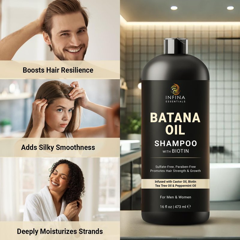 INFINA ESSENTIALS Batana Oil Shampoo with Biotin & Tea Tree Oil - Hair Growth & Thickening Shampoo for Men & Women - Sulfate Free, Promotes Hair Strength & Hydration, 16 fl oz