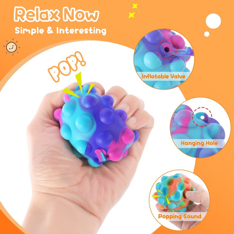 - 【ATTENTION】We've upgraded the pop fidget balls by adding a valve to the ball so they can be inflated and deflated for better storage. As soon as you open the valve, the ball will automatically fill with air in 3-5 seconds. Once the valve is closed, the ball won't leak air until you open the valve again. The valve design will not affect the popping and squeezing function. We also add keyhole to every ball, and each ball has a chain. You can use the ball as a keychain or use as hanging decoration.