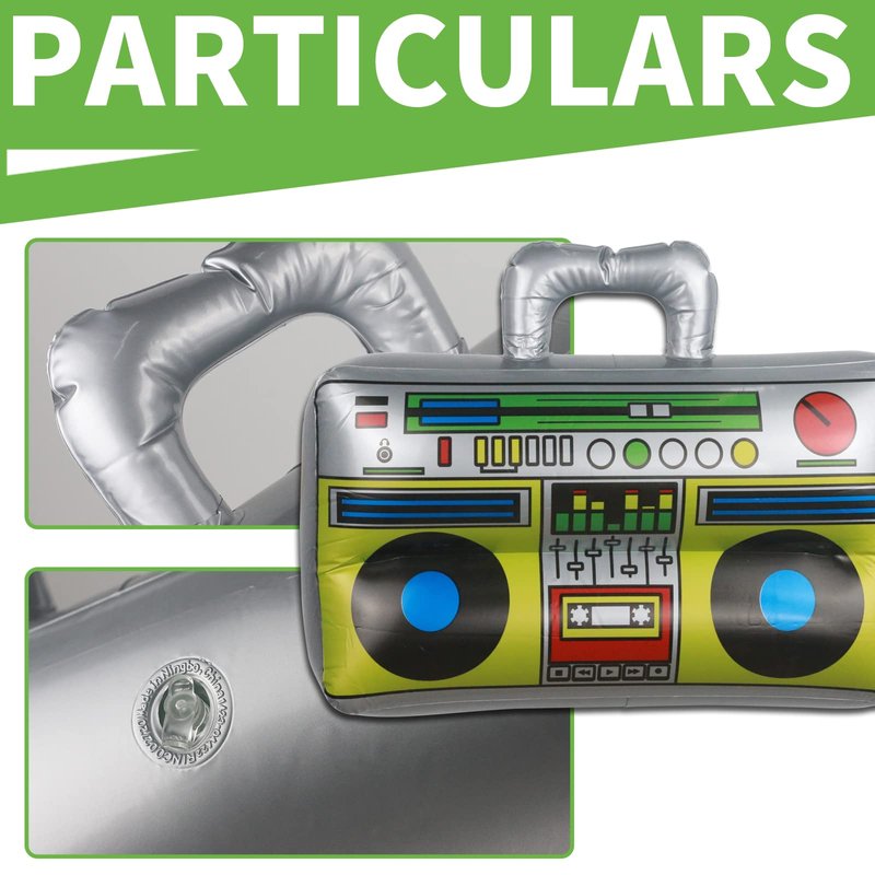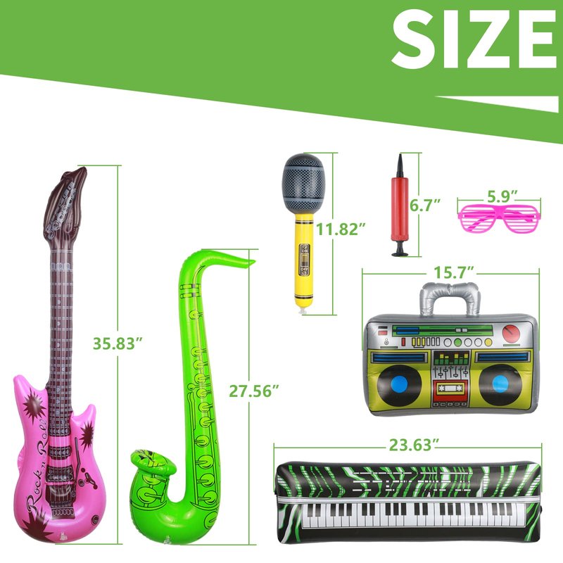 - [Large Size]: Inflatable guitars are 35.83 inches long; inflatable microphones are 11.82 inches long; inflatable saxophone is 27.56 inches long, inflatable boombox is 15.7inch long and 11.1inch width, inflatable keyboard is 23.63 inches long and shutter shading glasses are 5.90 inches long. They are close to real size and can be played by both adults and children.