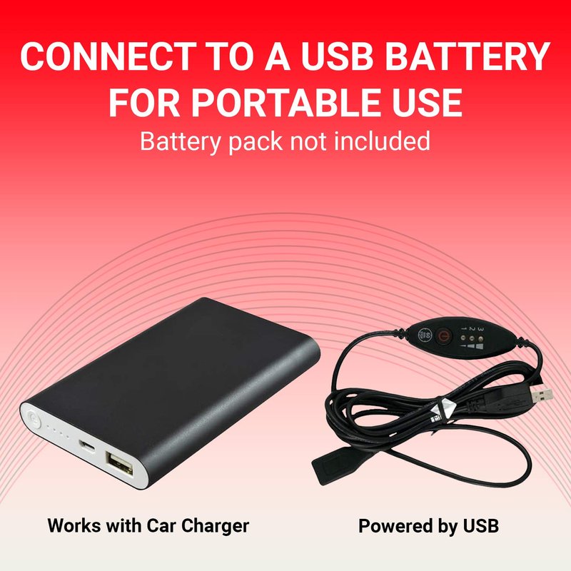 - BATTERY OPERATED: Qfiber works with any USB battery pack / power bank that outputs 5 volts at a rate of 3 amps to be a cordless heating belt that you can use in the car, on your computer, or just relaxing without being tethered by a cord to the wall. The battery pack is not included so be sure to check the specs on your power bank!