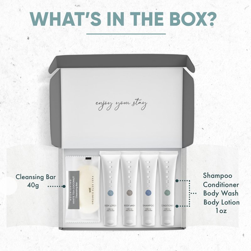 Infuse Amenity Kit | Boxed Hotel Toiletries | Bulk Set 1 oz Travel Size Shampoo, Conditioner, Lotion, Body Wash & Cleansing Bar for Guest Hospitality AirBnB/Vacation Rentals | 1 set per case
