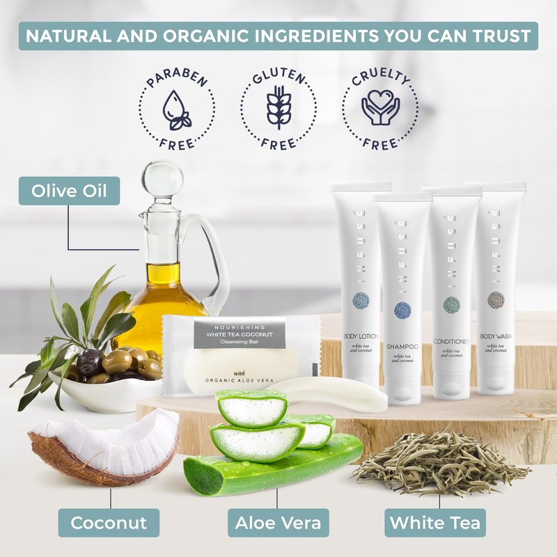 - WHY CHOOSE INFUSE? Our high-end formula & environmentally friendly beautiful design bring elegance to any upscale rental or vacation property. Our travel size, pump, and gallon toiletries are paraben-free, gluten-free & made with white tea and coconut for soft skin & hair! We offer a range of products and cater to all your on-the-go personal care needs.