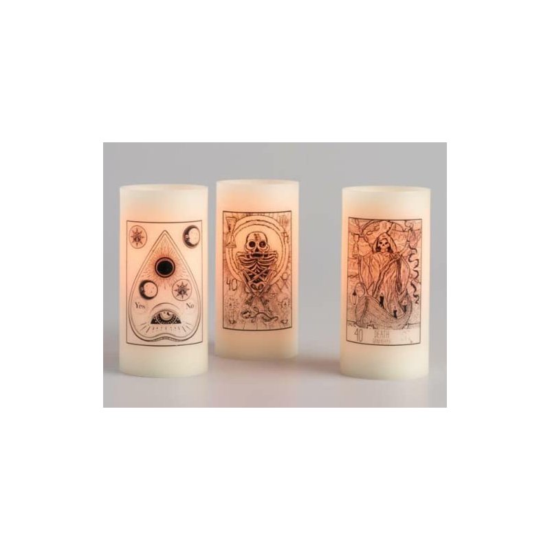 Tarot Cards Pillar Flameless Candles Set Of 3 Battery Operated 6" Tall, Battery Operated Safe Flameless Candle Great for Halloween Decor or Year round Hauntingly beautiful, . The flameless design allows you to enjoy the warm flicker of candlelight without the worry of an open flame.