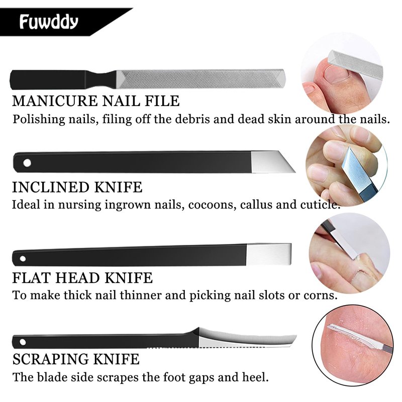 - PEDICURE KIT : If you had trouble with a thick nail, suffer from ingrown toenails, paronychia, corns, calluses, foot pads, dead skin, etc. , this professional toenail tool kit will be your best choice. The blade is sharp please use with care. Avoid use by children alone.