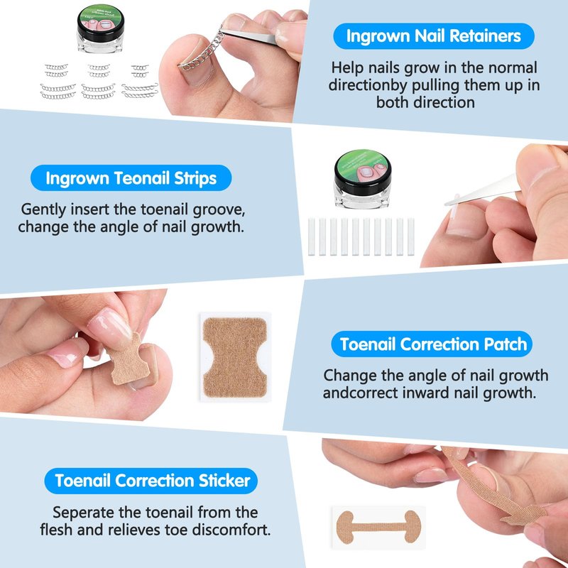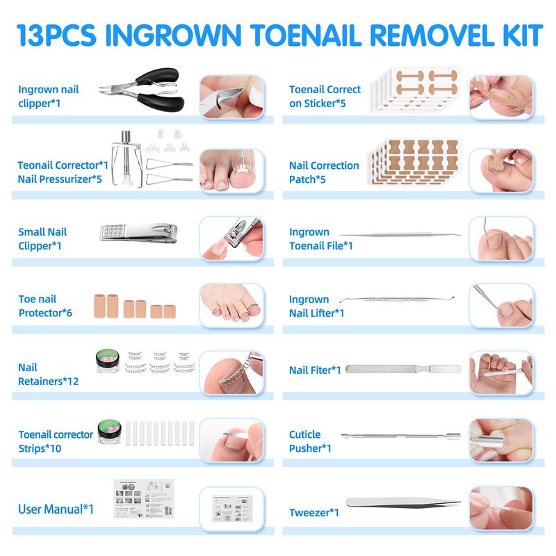 - 【13 Kinds of Ingrown Nail Tools】: Our ingrown nail removal kit provides a comprehensive solution to effectively remove ingrown toenails. It includes 13 kinds of tools(total 113pcs) which has everything you need to get your toe nails back in shape. Includes nail clipper*2, nail corrector*1, toenail corrector strips*10, nail retainers*12, nail protector*6, toenails corrector patch*5, correction sticker*5, ingrown toenail lifter*1, nail file*2, tweezer*1, cuticle pusher*1