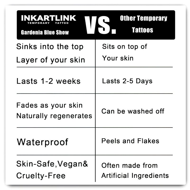 - Environmental-Friendly and Skin-Safe: INKARTLINK temporary tattoos are made by botanical vegetarians, which is completely safe for the skin! INKARTLINK is made of "Gardenia Blue Show" as raw materials, excluding any harmful chemicals. Caution: Please do not use it on your face, wounds, or sensitive skin!
