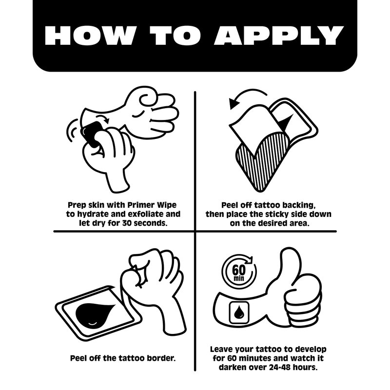 - Easy to Apply: Easily apply your Inkbox tattoo in 1-2 minutes and then chill for 1 hour. Take this time to read, sing, stream, meditate... you do you. Keep in mind, your tattoo will darken over the course of 24-48 hours.