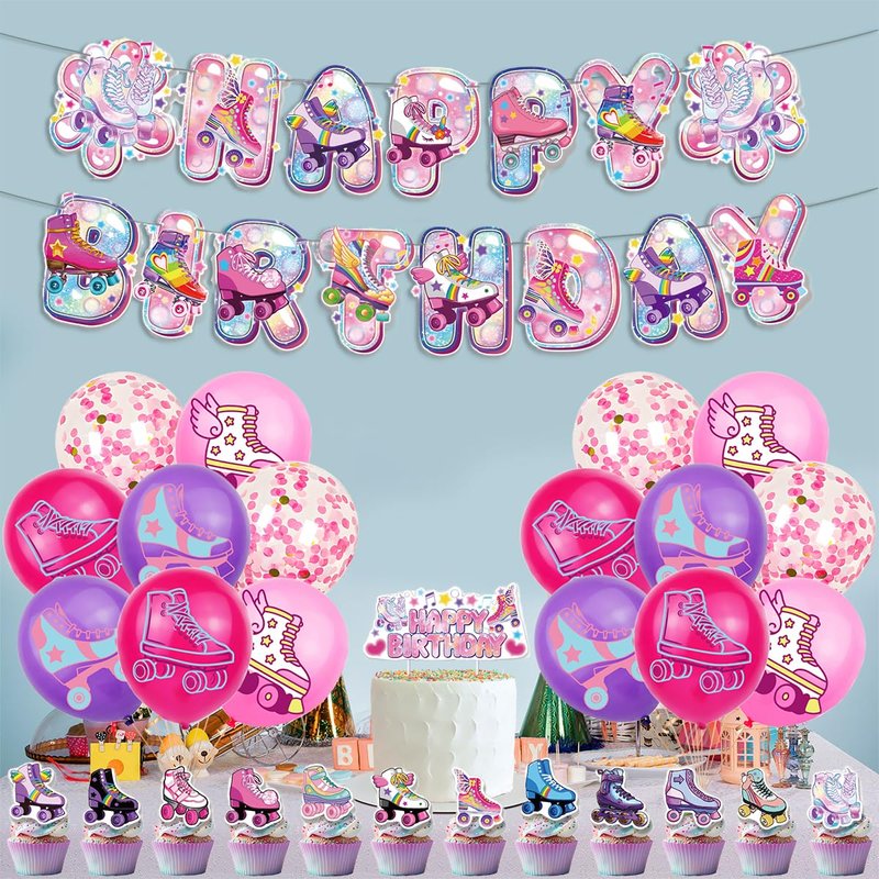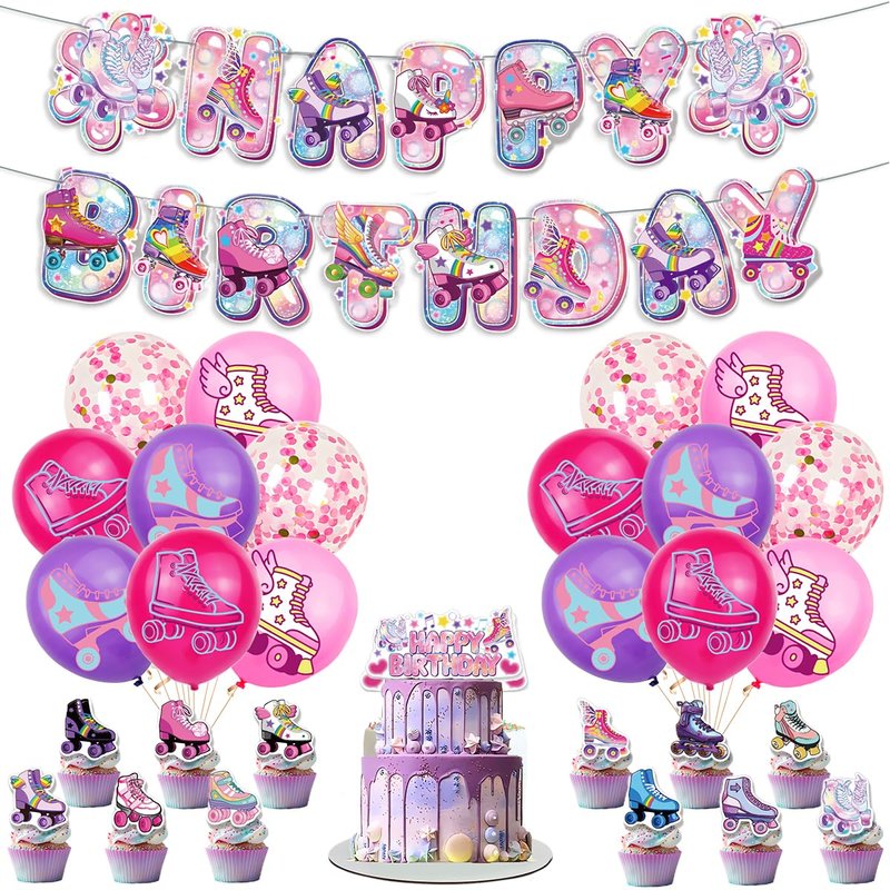 - 1.Rainbow Glitter Roller Skating Party Decoration: 1pc rainbow glitter happy birthday banner, 1pc large cake topper, 24pcs cupcake toppers, 16pcs latex balloons, this roller skating birthday banner can set the mood of the roller skating birthday party.