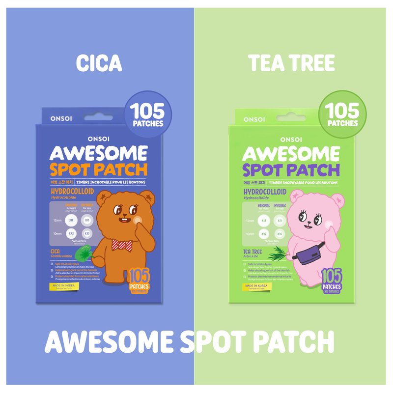 ONSOI Blemish Patch offers a complete acne treatment for face with 105 high-quality hydrocolloid pimple patches for face, designed to effectively absorb gunk and help reduce acne marks. This set includes Invisible Day Patch and Original Night Patch for round-the-clock acne care. Choose between Cica and Tea Tree options, both of which soothe and protect your skin. These hydrocolloid acne patches provide secure adhesion and are pre-cut for easy peel, ensuring they stay on without easily falling off. Made in Korea, these blemish patches are suitable for all skin types, making them a perfect addition to your skincare routine. Whether you're looking for zit patches or hydrocolloid patch solutions, ONSOI has you covered with these Korean pimple patches.