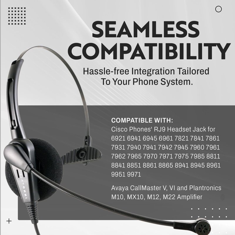 Compatible with Cisco Phones' RJ9 Headset Port. Classic style design, cost effective superior durable headset is focusing on Telemarketing service. The superior durability of the Classic Monaural headset provides long lasting value under the most telephone-intensive conditions and cost-effective solution to customer call centers. Easily stay-put click-stop headband and soft Rubber T-bar supports all-day long comfortable wearing. With your office phone system, Static shock protecting Noise cancelling mic delivers reduced background noise in a noisy office while enjoying additional productivity keeping both hands free. The flexible goose-neck mic boom allows you to get an optimal positioning from the mouth and the large ear cushion blocks surrounding noise outstanding