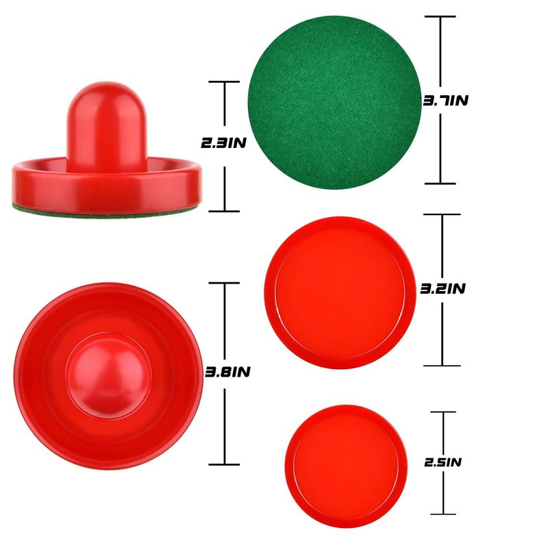 - [PERFECT FOR] - The pusher is 3.8 x 2.3 inches,the small puck is 2.5 inches thickness 0.12", the big puck is 3.25 inches thickness 0.16" , and the green pad is 3.7 inches. They are suitable for most standard air hockey tables. "PLEASE MAKE SURE THE TABLE SLOT IS FIT to THIS PUCK SIZE BEFORE PURCHASE"
