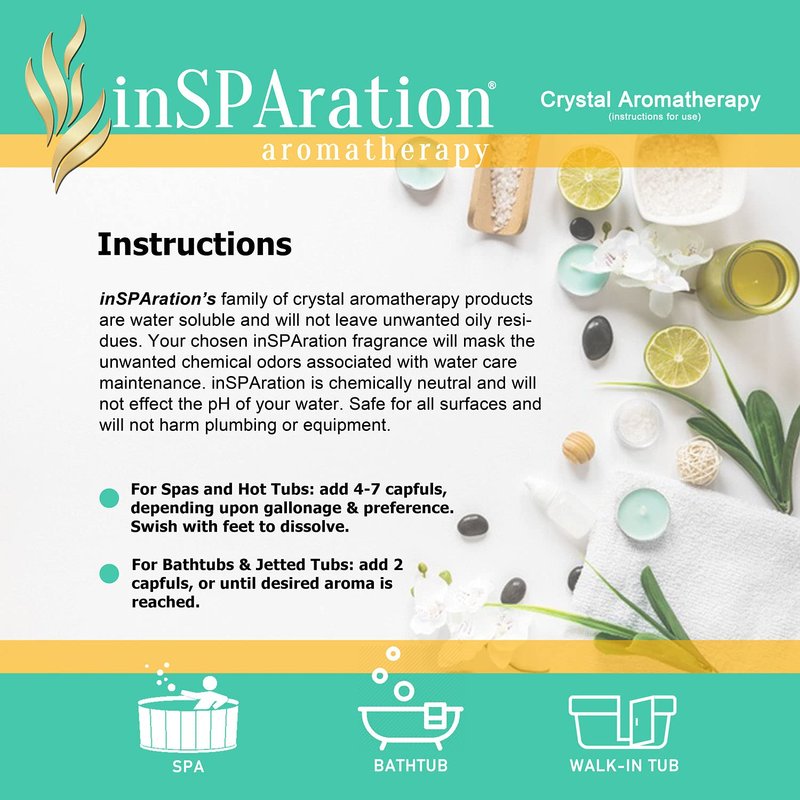 The finest aromatherapy crystals for hot tub spas and jetted whirlpool baths. Our unique and delightful inSPAration scents are crafted for total hot water enjoyment, creating a rich, soothing spa experience. The amazingly pleasurable fragrances promote total relaxation, while leaving your skin feeling soft and moisturized. Freedom from chemical odors! Net wt.: 13 oz. (368 g.)