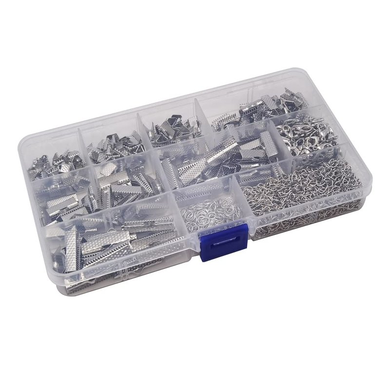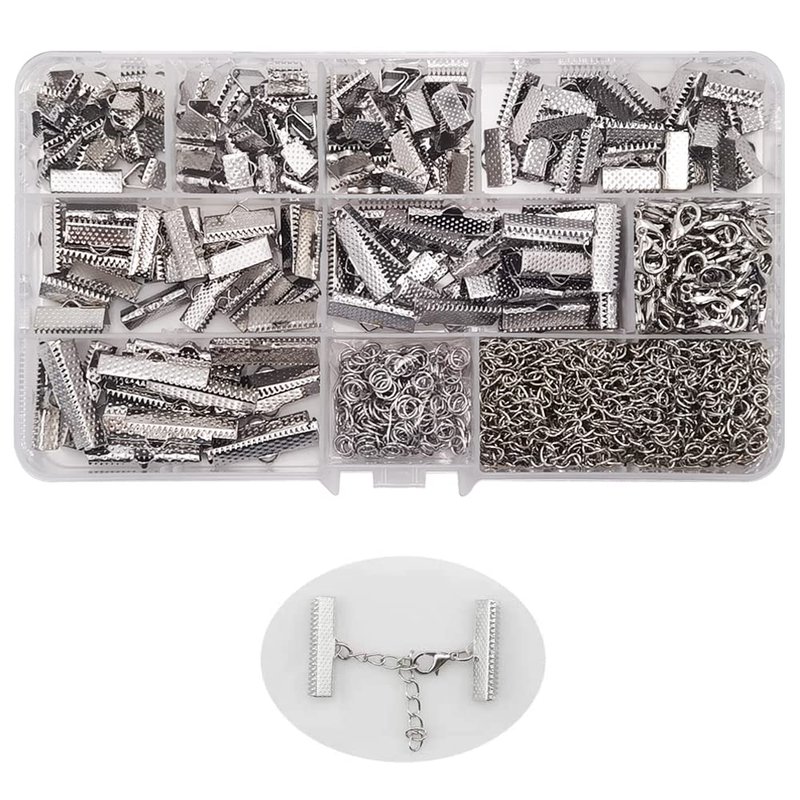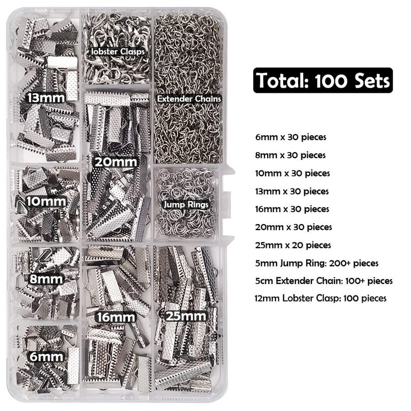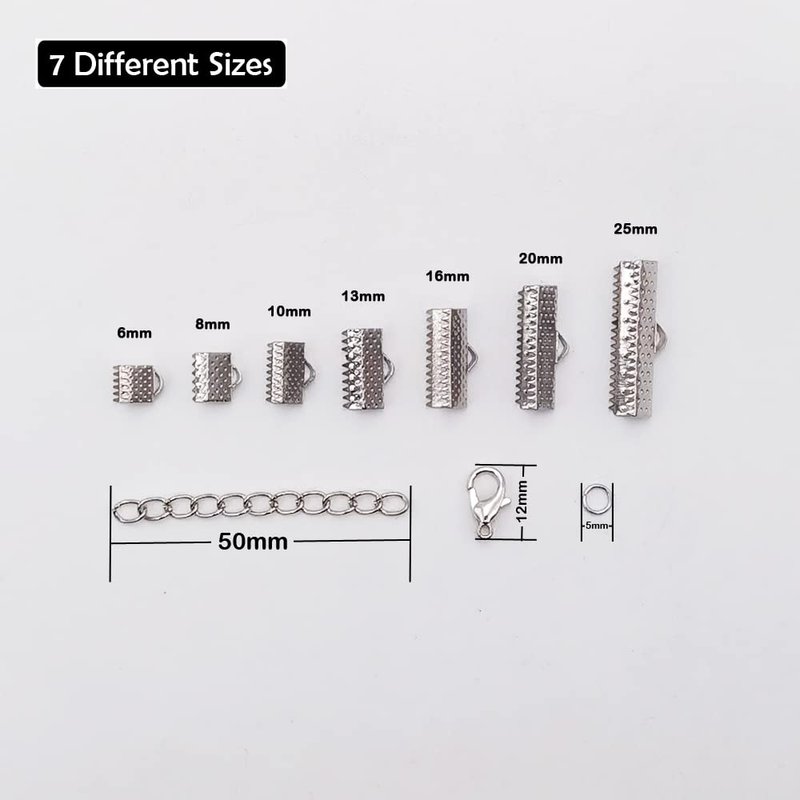 INSPIRELLE 100 Sets Assorted Size Rhodium Ends for Ribbon Bracelet Bookmark Making Crimps Kit with Lobster Clasps and Chain Extenders