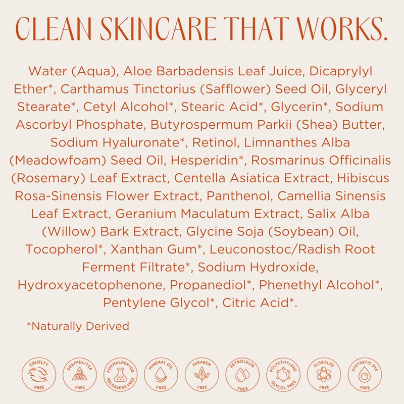 - It's Glow Time: Our Retinol Nighttime Moisturizer combines Retinol, Vitamin C, Hyaluronic Acid, and Green Tree Extract to brighten, moisturize and balance the skin to reveal a youthful glow