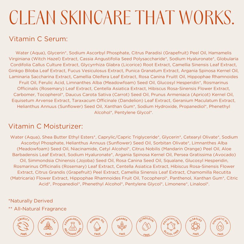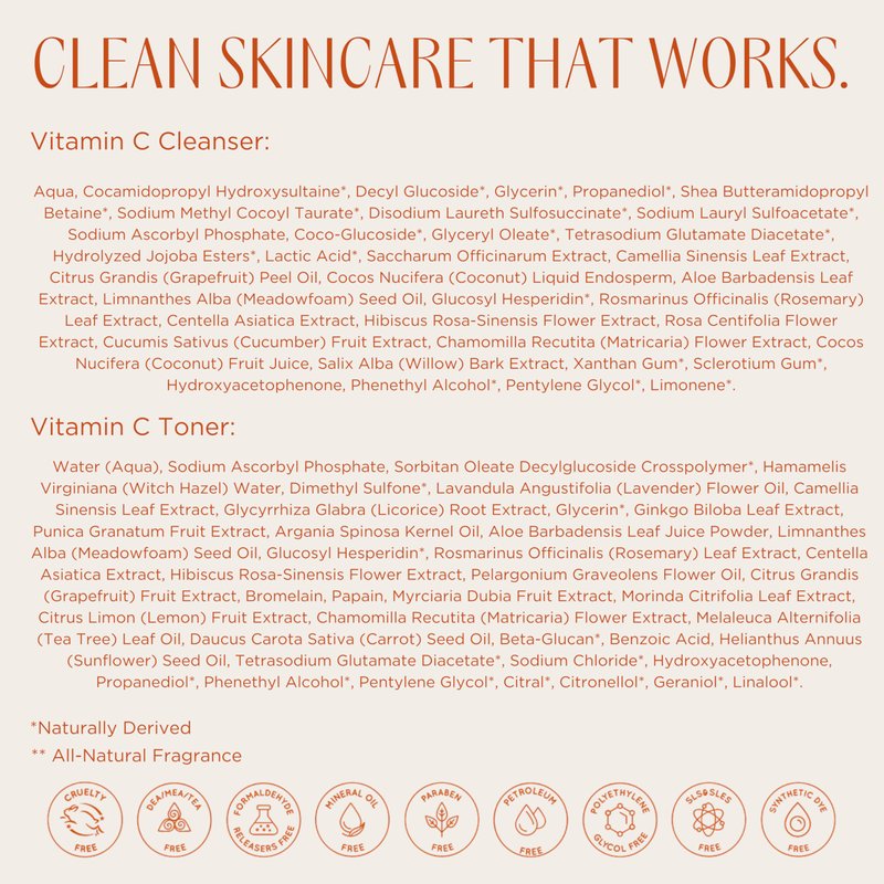 - It's Glow Time: This set features our most loved skincare essentials, our Vitamin C Cleanser, Toner, Serum and Vitamin C Moisturizer, a powerful skincare routine that brightens, hydrates and nourishes for refreshed and glowing skin
