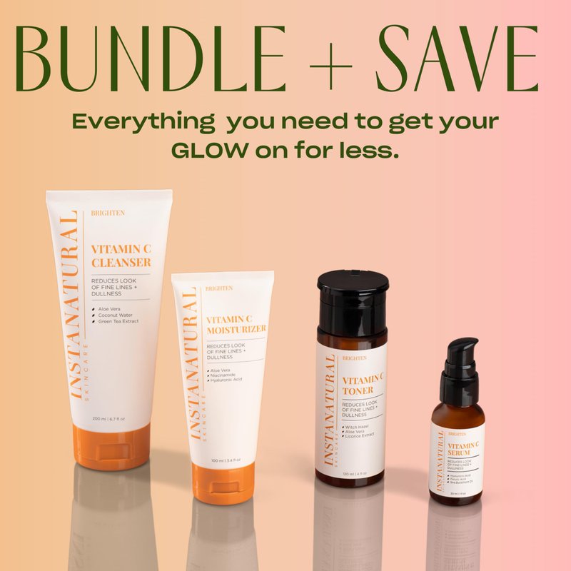 Brighten Up. Our Vitamin C Cleanser features natural antioxidant properties that prevent signs of aging while brightening skin tone. Infused with Coconut Water, Aloe Vera and a blend of Green Tea and Sugar Cane extracts, our cleanser defends and hydrates, without dryness or tightness or without clogging pores, for a refined and radiant complexion. Our Vitamin C Toner is a all-in-one hydrator infused with anti-aging ingredients that will leave skin feeling refreshed and balanced without dryness or tightness. A powerful combination of Vitamin C, Witch Hazel and botanical extracts refine pores and fights free radicals while brightening the appearance of skin. This toner also support the skin's natural barrier, priming it to absorb serums and moisturizers more effectively. Our Vitamin C Serum is packed with nutrients to brighten the skin and prevent common signs of aging such as the appearance of lines, wrinkles and discoloration and hyperpigmentation. This lightweight, quick absorbing serum provides deep hydration without dryness or tightness. To enhance the antioxidant benefits of Vitamin C, our serum also includes Ferulic Acid to defend against environmental aggressors, as well as Hyaluronic Acid and Sea Buckthorn Oil to support the skin's protective barrier. Our Vitamin C Moisturizer is formulated to provide antioxidant defense and visibly reduce common signs of aging in the skin. The power of Vitamin C in enhanced with Niacinamide, Hyaluronic Acid and plant extracts to soften lines and wrinkles while supporting healthy collagen production for a radiant and healthy complexion. Our Vitamin C Favorites, with Sodium Ascorbyl Phosphate, a skin friendly form of Vitamin C, are great for all skin types and gentle enough even for sensitive skin. At InstaNatural, our mission is to put people first by creating skincare that is botanically based, active-led, and proven to perform. Our skin care products are formulated without 1500+ ingredients such as parabens, sulfates, synthetic fragrance, PEGs, petroleum, and formaldehyde releasers. Our products are certified cruelty-free, not tested on animals.