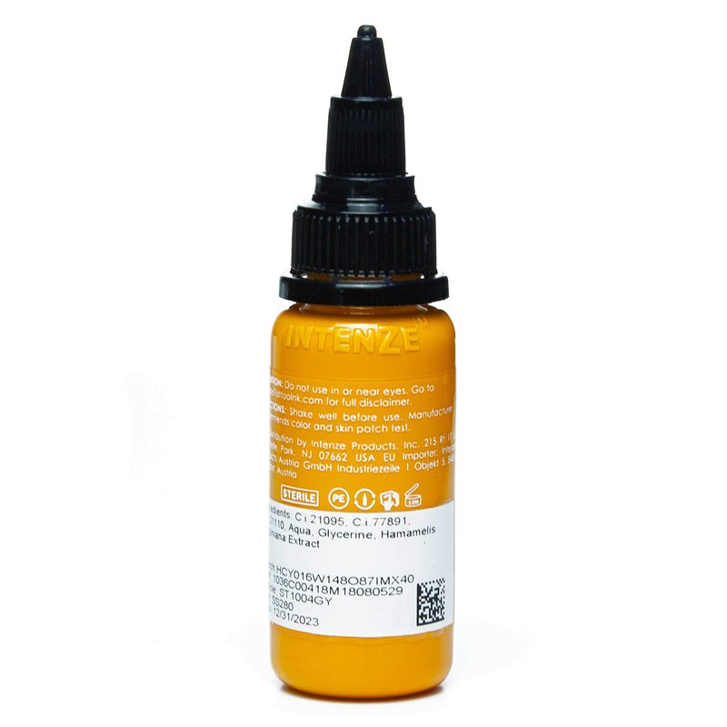 Intenze Golden Yellow Tattoo Ink is ideal for fantasy and dragon pieces. It goes well with a soft reddish brown and heals beautifully. It can also be used to create the softest shades of browns