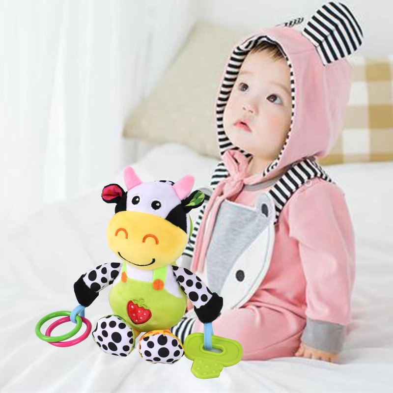 Interactive 3D Teethers Musical Baby Toy-Plush Stroller Hanging Doll, for Infant Baby Musical Stuffed Animal Activity Soft Toys with Multi-Sensory Crinkle, Rattle and Textures, for Tummy Time Newborn 0-3-6-12 Months Boys, Girls, Cows
