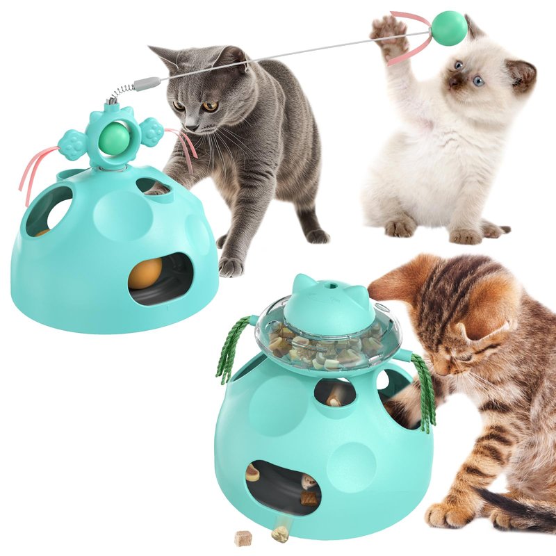 - 4 In 1 Interactive Cat Toy-- This toy are two interchangeable tops, one that holds treats and one that has extra tassels.These two modules can be assembled with the main toy body the top can be fitted with a cat teaser wand, and the body is dug holes to hide ball cat toys to meet the needs of pet cats to play