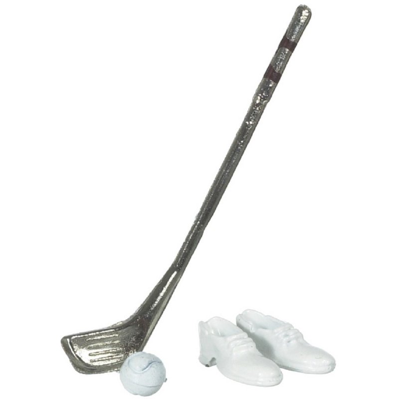 Golf Club Set with Golf Shoes designed for the 1:12 scale miniature setting made of tin and paper by International Miniatures. Measures: golf club - 2 1/2 in long shoes - 3/4 in long. Made of painted metal.