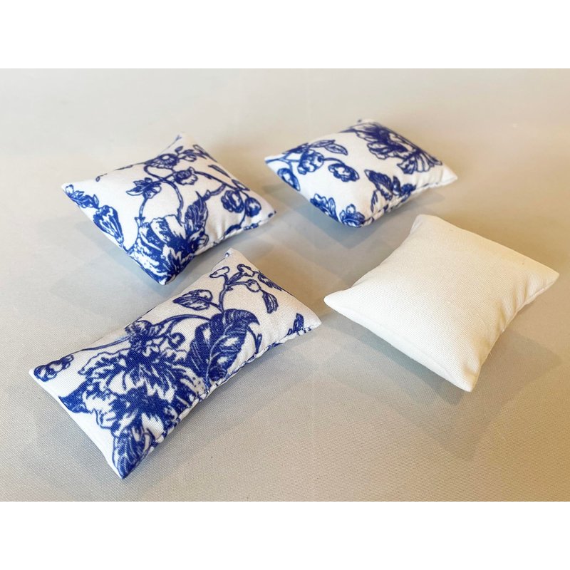 A beautiful and unique 5-piece bedroom bedding set for your dollhouse. This masterfully finished set consists of a comforter/blanket and four pillows. The comforter is finished on both sides with a beautiful blue and white flower fabric. There are a total of four pillows, two standard sized pillows and a long pillow with the same blue flower fabric, and one pillow with a white fabric . All pieces are in 1:12 scale and fit into any dolls house. They can be washed and the pillow cases can be removed as well to be used with other inserts.